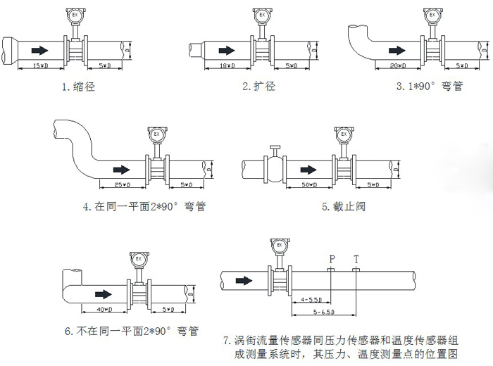 流量計上游若有活塞式或柱塞式泵,活塞式或羅茨式風機、壓縮機,流量計上游應有不小于25D的等徑直管段,下游應有不小于5D的等徑直管段。